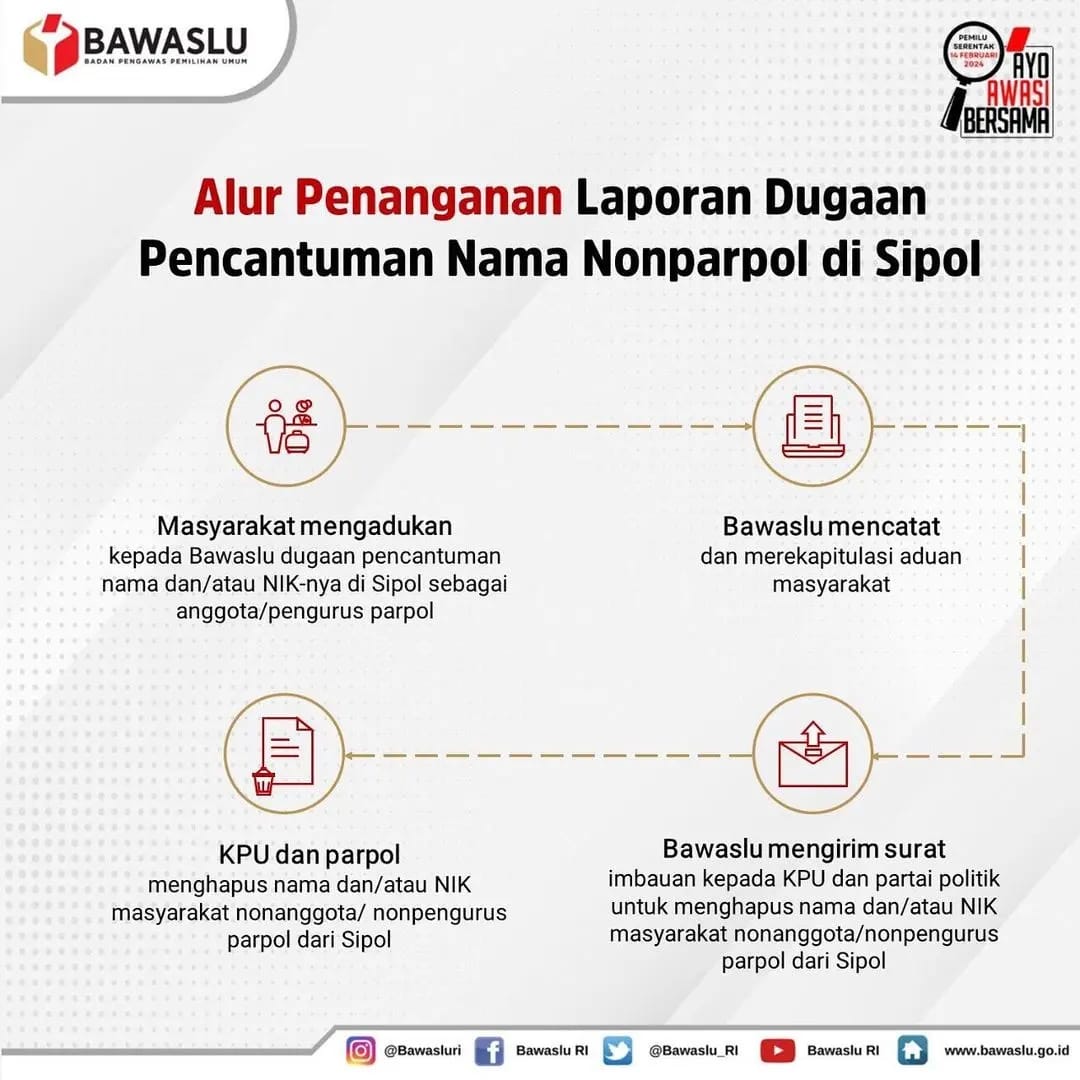 Kemudian Bawaslu mencatat dan merekapitulasi aduan masyarakat. Dilanjut Bawaslu mengirim surat himbauan kepada KPU dan partai politik untuk menghapus nama dan/atau NIK masyarakat non anggota/non pengurus Partai politik dari Sipol.
