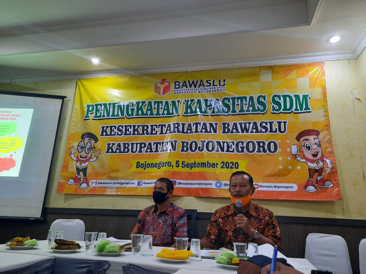 Bojonegoro, bojonegoro.bawaslu.go.id – Dalam kegiatan peningkatan kualitas SDM di lingkungan Bawaslu Bojonegoro pada hari Sabtu (05/09/2020) bertempat di Hotel Griya Dharma Kusuma, Bawaslu Bojonegoro juga mendapatkan materi tentang tatacara pengelolaan kearsipan. Materi tersebut disampaikan oleh Kepala Dinas Perpustakaan dan Kearsipan Kabupaten Bojonegoro, Kamidin.