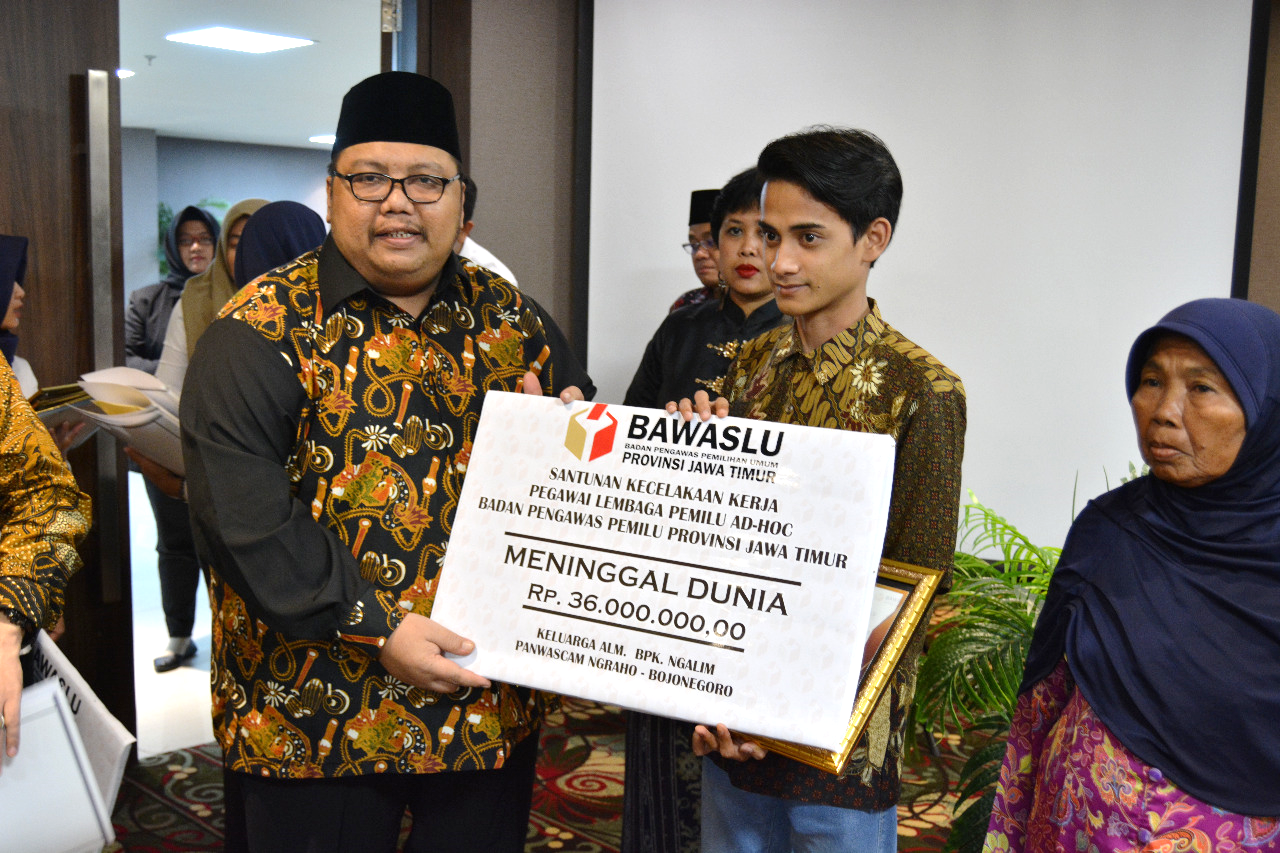 Foto Ahmad Rifaie Menerima Santunan Yang Diserahkan Moh. Amin Ketua Bawaslu Provinsi Jawa Timur