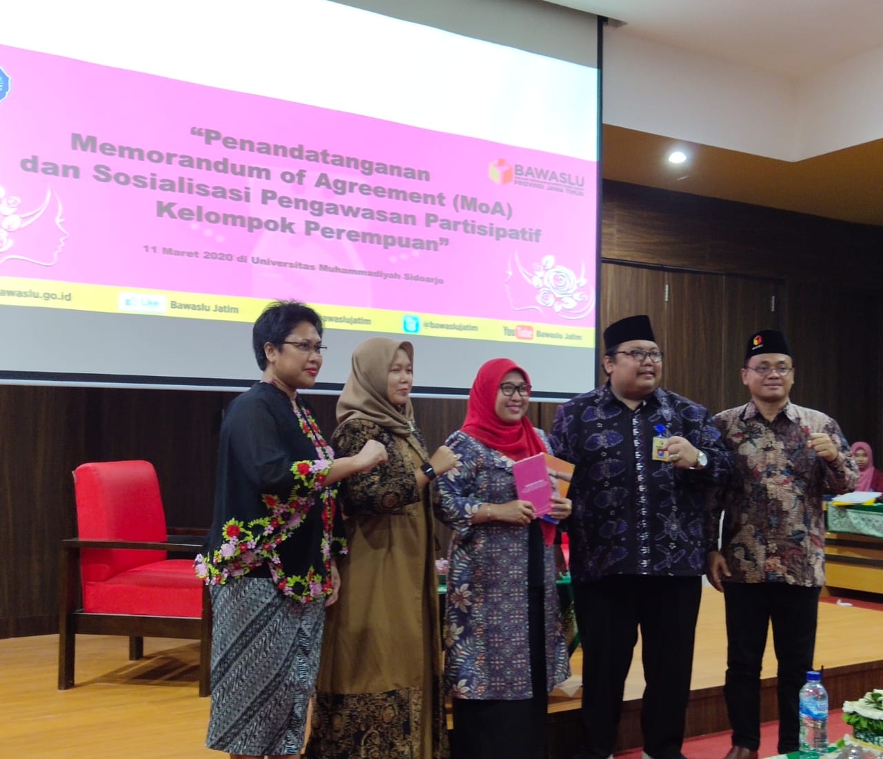 Sidoarjo, bojonegoro.bawaslu.go.id. Badan Pengawas Pemilihan Umum (Bawaslu) Kabupaten Bojonegoro hadiri acara launching buku bersamaan dengan Penandatanganan Kerja Sama antara Bawaslu Jawa Timur dengan Universitas Muhammadiyah Sidoarjo, dan sosialisasi pengawasan partisipatif untuk kelompok perempuan.