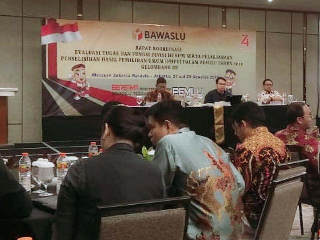 Sehubungan dengan telah selesainya tahapan pemberian keterangan tertulis pada Perselisihan Hasil Pemilihan Umum (PHPU) dimahkamah Konstitusi. Badan Pengawas Pemilihan Umum Republik Indonesia mengadakan Rapat koordinasi evaluasi Tugas dan Fungsi Divisi Hukum Serta Pelaksanaan Perselisihan Hasil Pemilihan Umum (PHPU) Dalam Pemilu Tahun 2019 – Gelombang III.