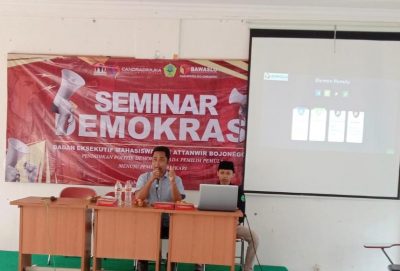 Bojonegoro, bojonegoro.bawaslu.go.id - Seminar Demokrasi dengan tema pendidikan politik bagi pemilih pemula menuju pemilu berintegritas yang diselenggarakan oleh BEM STAI Attanwir, Minggu (13/03/2022). Kegiatan berlangsung sekira pukul 13.00 WIB hingga 16.30 WIB yang bertempat di Auditorium STAI At Tanwir Bojonegoro. Peserta sebanyak 60 yang terdiri dari Pengurus BEM, HMJ dan Mahasiswa.