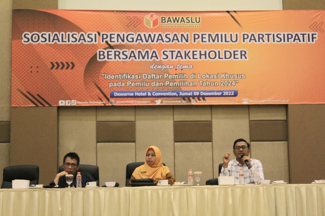 Bojonegoro, bojonegoro.bawaslu.go.id – Dalam rangka meningkatkan pengetahuan pengawasan Pemilihan Umum (Pemilu) dan jajaran stakeholder tentang pengawasan identifikasi daftar pemilih di lokasi khusus pada Pemilu 2024, Bawaslu Bojonegoro menyelenggarakan Sosialisasi Pengawasan Pemilu Partisipatif bersama Stakeholder dengan tema Identifikasi Daftar Pemilih di Lokasi Khusus pada Pemilu dan Pemilihan Tahun 2024, Jumat (09/12/2022).