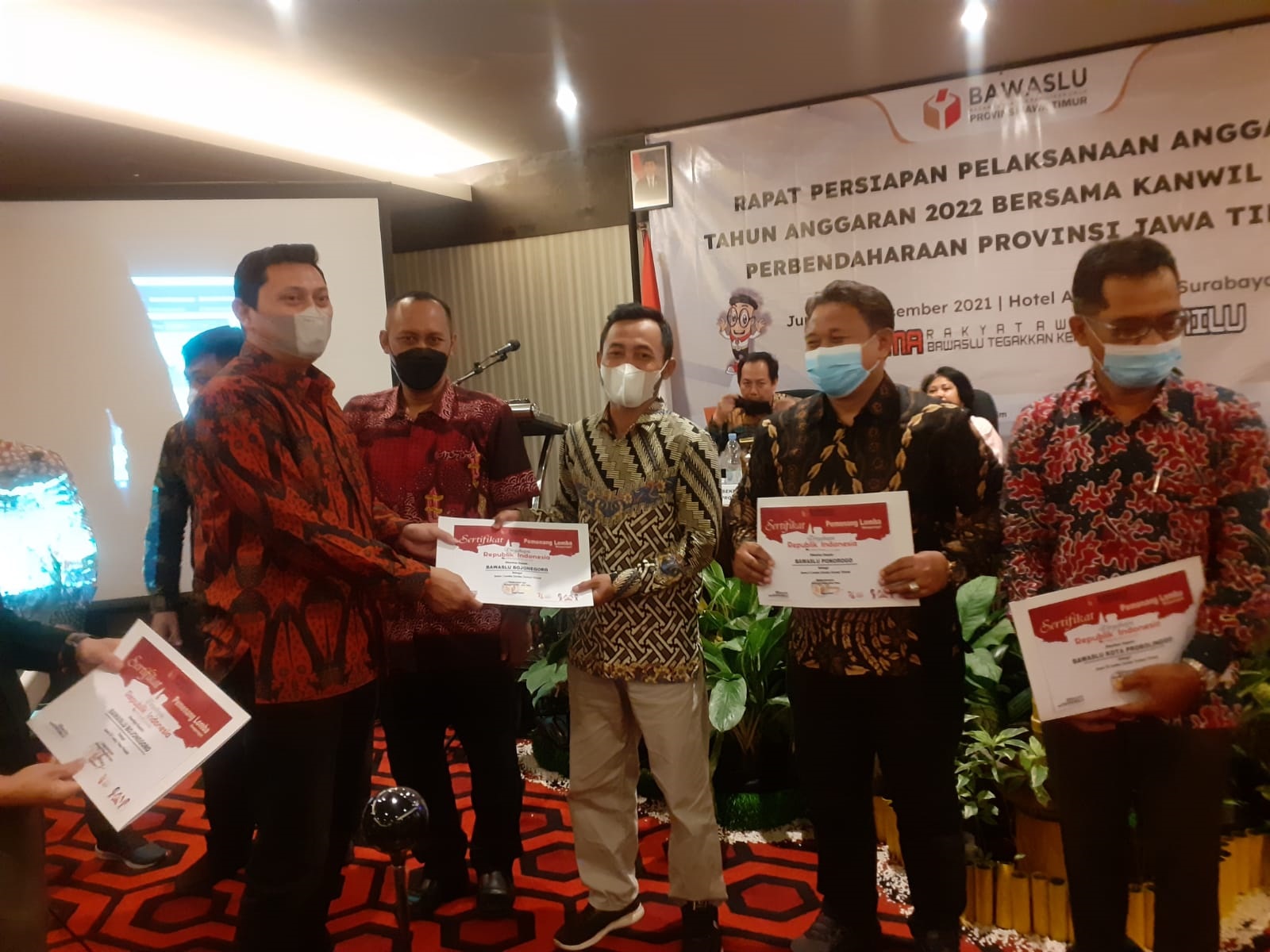 Jum’at (17/12/2021) Bawaslu Kabupaten Bojonegoro mendapat Sertifikat penghargaan dari Bawaslu Provinsi Jawa Timur atas diraihnya juara satu lomba cerdas cermat dan juara tiga lomba video pendek dengan tema Demokrasi Tangguh, Indonesia Tumbuh.