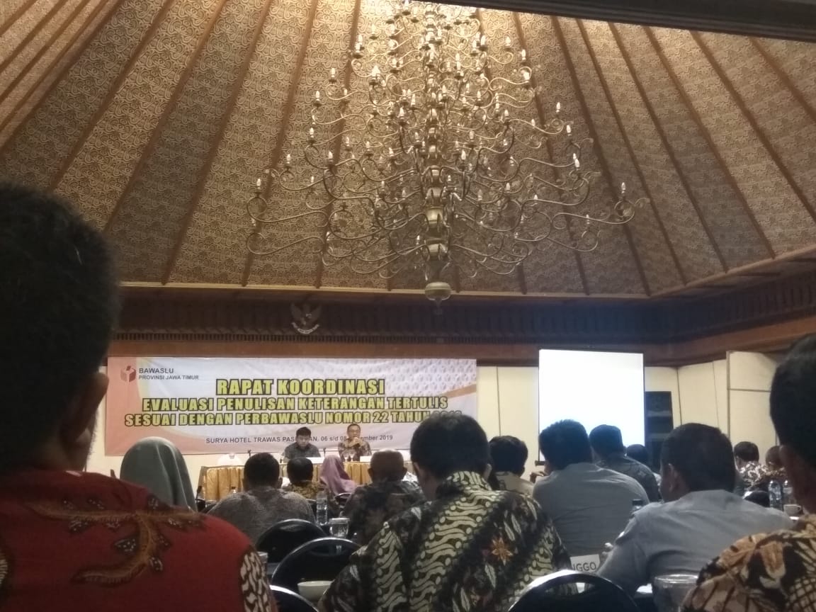Pasuruan, bojonegoro.bawaslu.go.id Badan Pengawas Pemilihan Umum (Bawaslu) hadiri Rapat Koordinasi evaluasi penyusunan keterangan tertulis sesuai dengan Perbawaslu Nomor 22 tahun 2018 tentang tata cara pemberian keterangan dalam perselisihan hasil di Mahkamah Konsitusi.