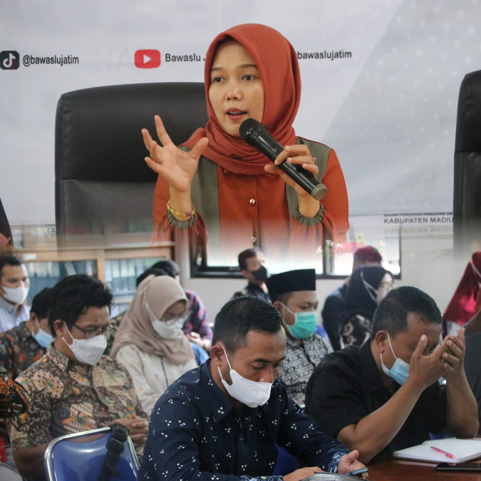 Kordiv Humas Bawaslu Provinsi Jawa Timur, Nur Elya Anggraini, Ketua Komisi Informasi Provinsi Jawa Timur, Imadoeddin , serta Kabag Hukum Humas dan Data Informasi, Lucia Martina Dewi Billem hadir sebagai Narasumber kegiatan.