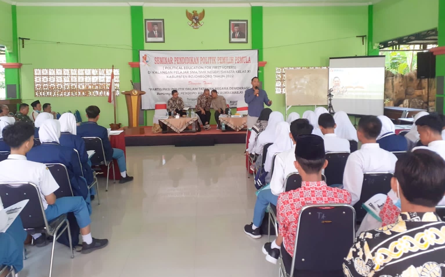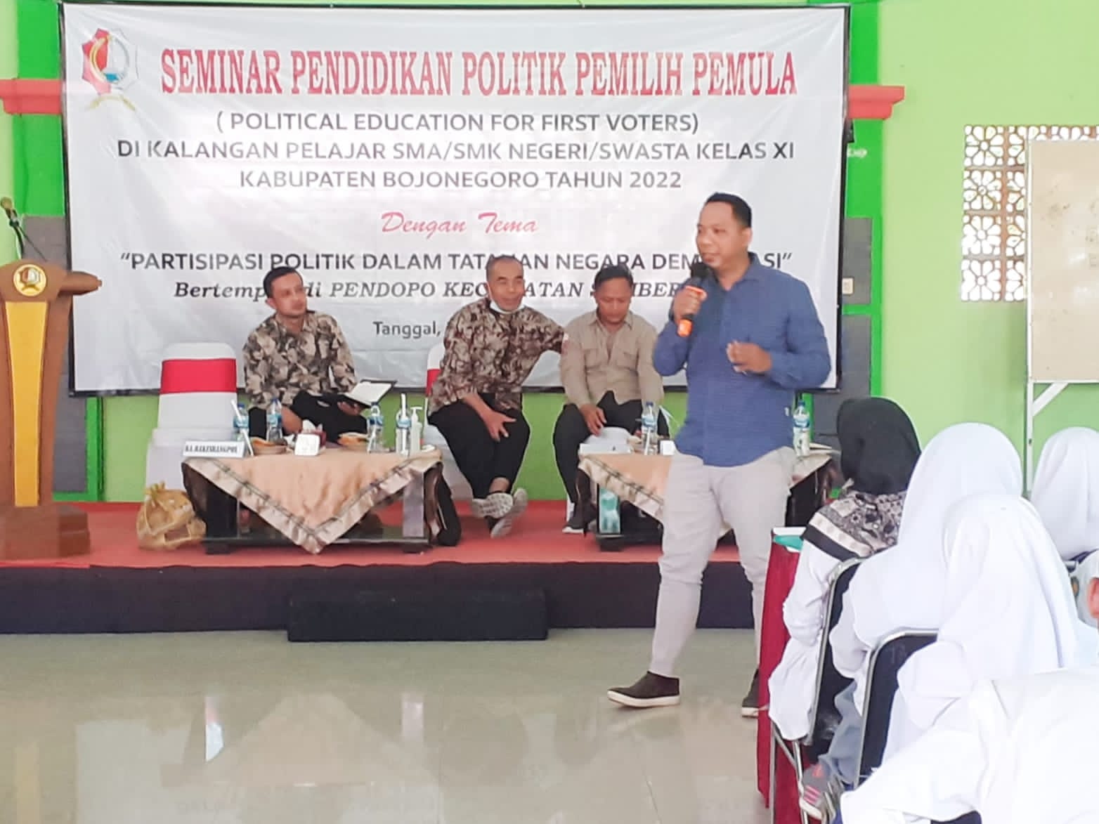 Bojonegoro, bojonegoro.bawaslu.go.id – Dua tahun lagi, Indonesia akan melaksanakan pesta Demokrasi yaitu tepat tanggal 14 Februari 2024 akan dilaksanakannya Pemilu serentak. Untuk meningkatkan kesadaran politik dan meningkatkan kualitas demokrasi, Anggota Bawaslu Bojonegoro Mochammad Alfianto sampaikan materi pengawasan partisipatif kepada pemilih pemula, Selasa (26/07/2022).