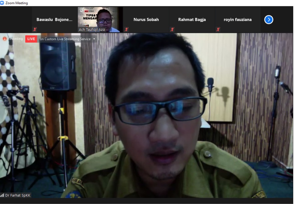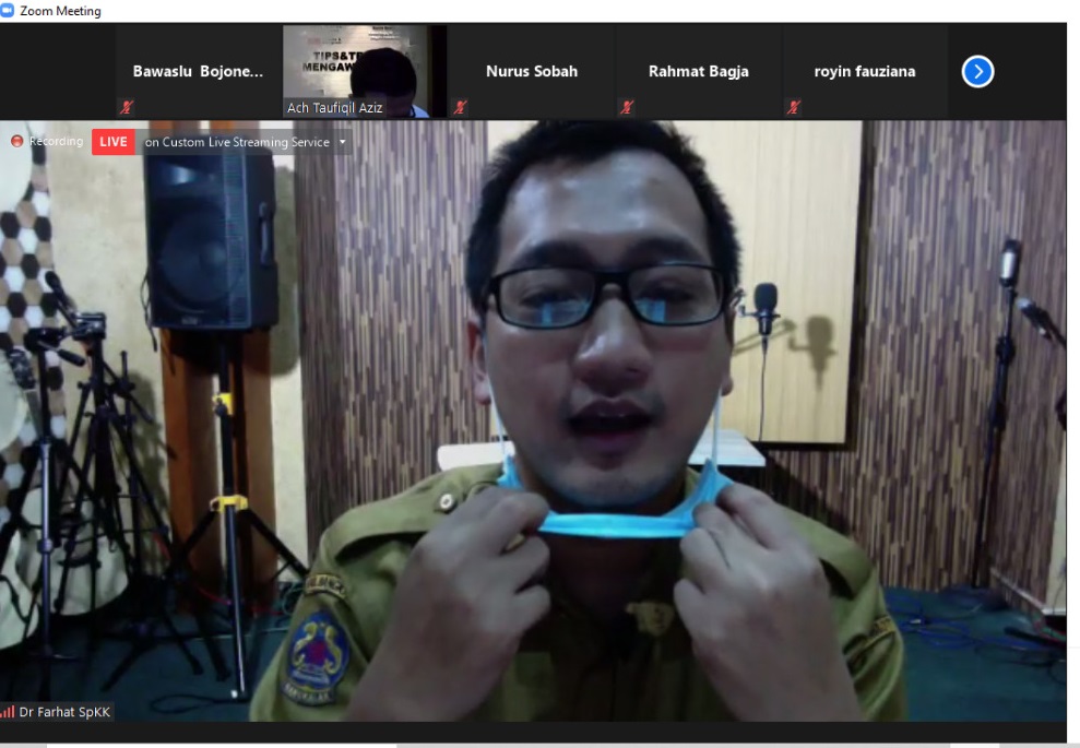 Bojonegoro, bojonegoro.bawaslu.go.id – Sebagai salah satu Narasumber dalam kegiatan tips dan trik sehat awasi Pilkada, dr. Farhat Surya Ningrat, Sp.K., selakuKetua IDI Bangkalan dan Pengurus IDI Jawa Timur sampaikan tips sehat awasi Pilkada di tengah pandemi Covid 19, Senin (27/07/2020).