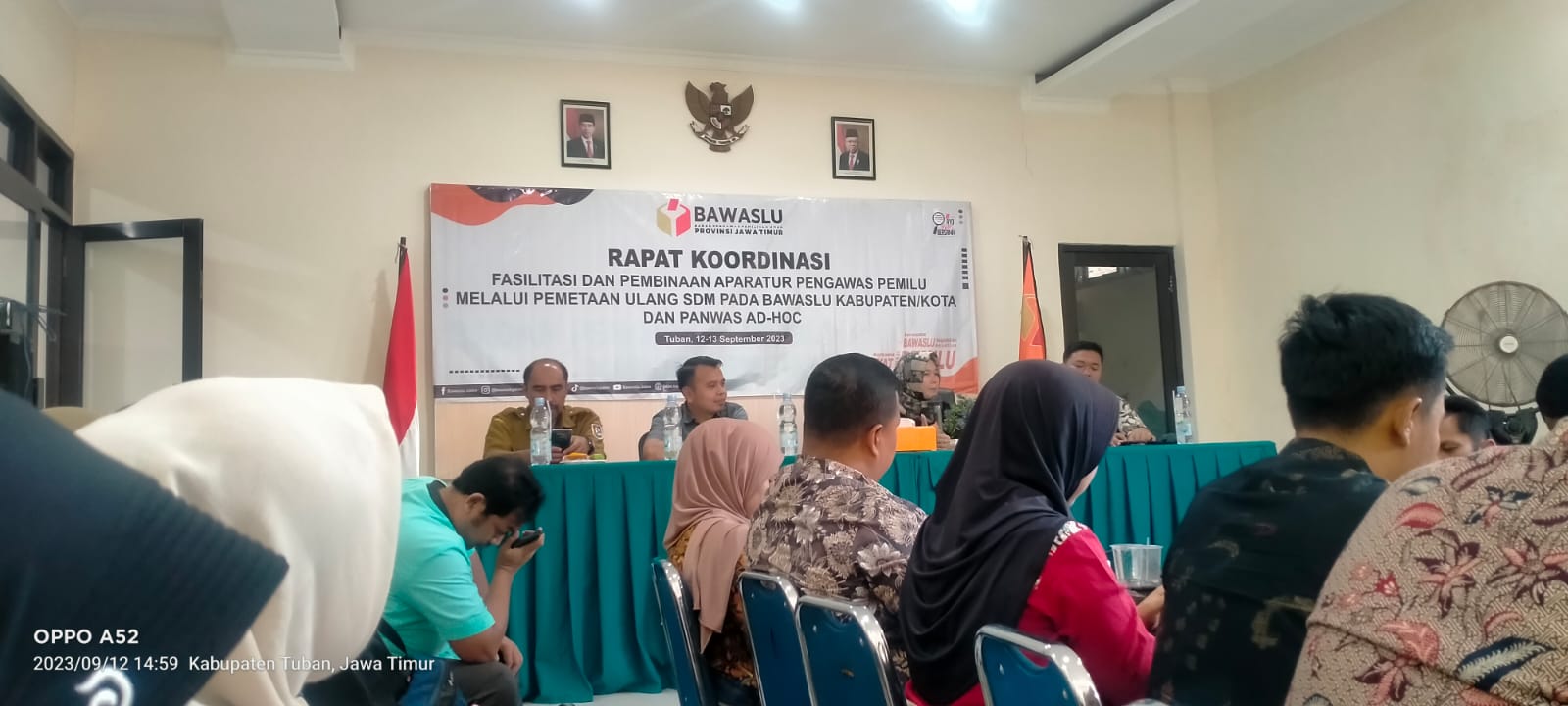 Tuban, bojonegoro.bawaslu.go.id - Sehubungan dengan kebutuhan fasilitasi dan pembinaan aparatur pengawas pada Bawaslu Kabupaten/Kota dan Panwas Ad-Hoc, Bawaslu Kabupaten Bojonegoro mengikuti Rapat Koordinasi (Rakor). Rakor diselenggarakan oleh Bawaslu Jawa Timur bertempat di Kantor Bawaslu Kabupaten Tuban tanggal 12 hingga 13 September 2023.