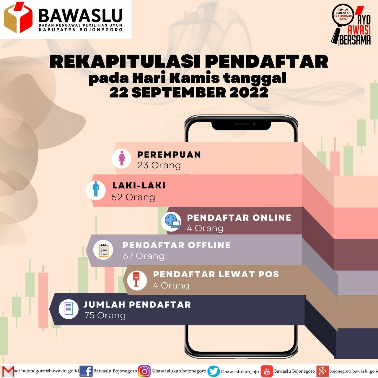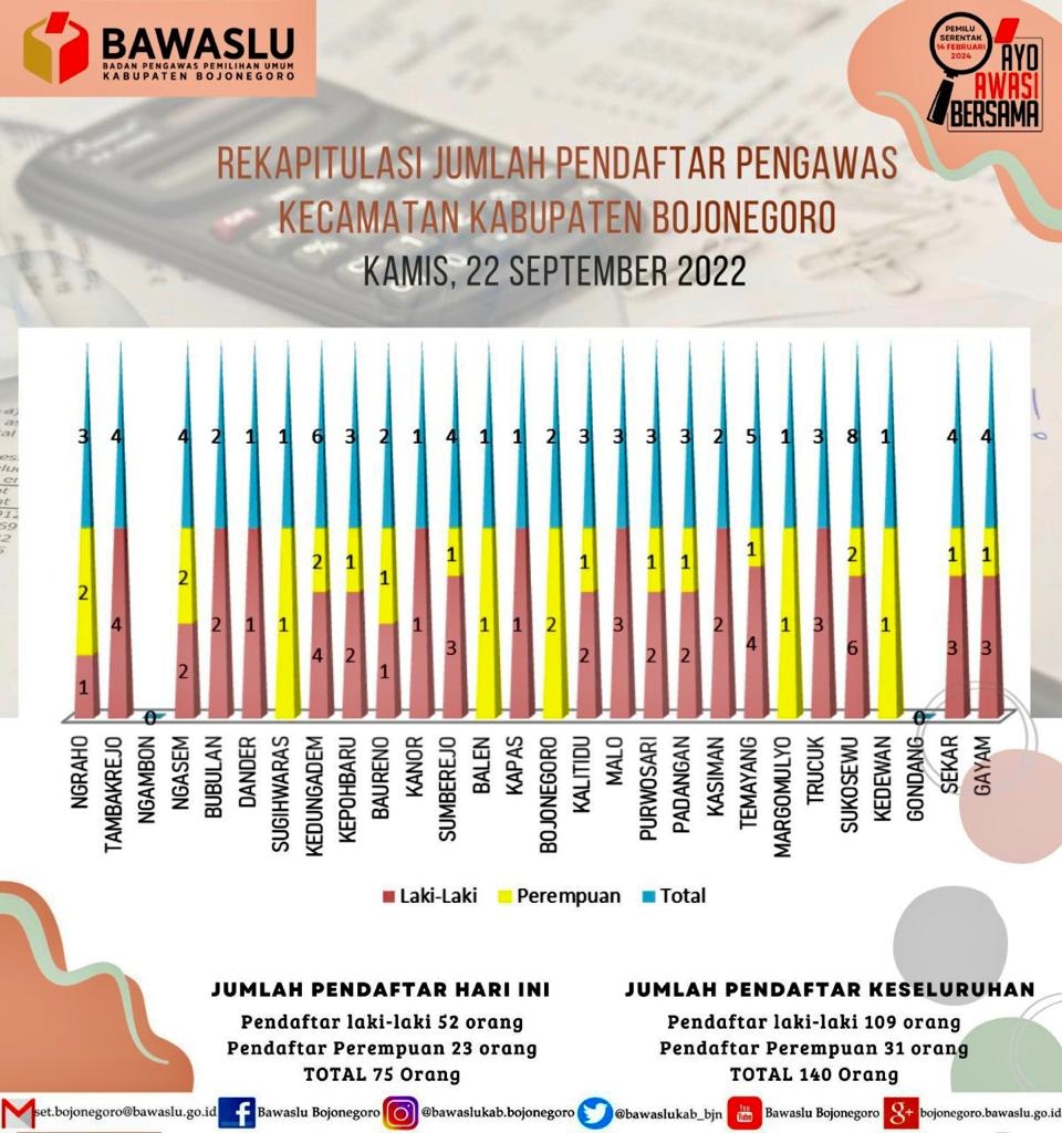 Dari total 75 orang pendaftar di hari kedua ini terdiri dari 52 orang laki-laki dan 23 orang perempuan yang tersebar di 28 Kecamatan di Bojonegoro.