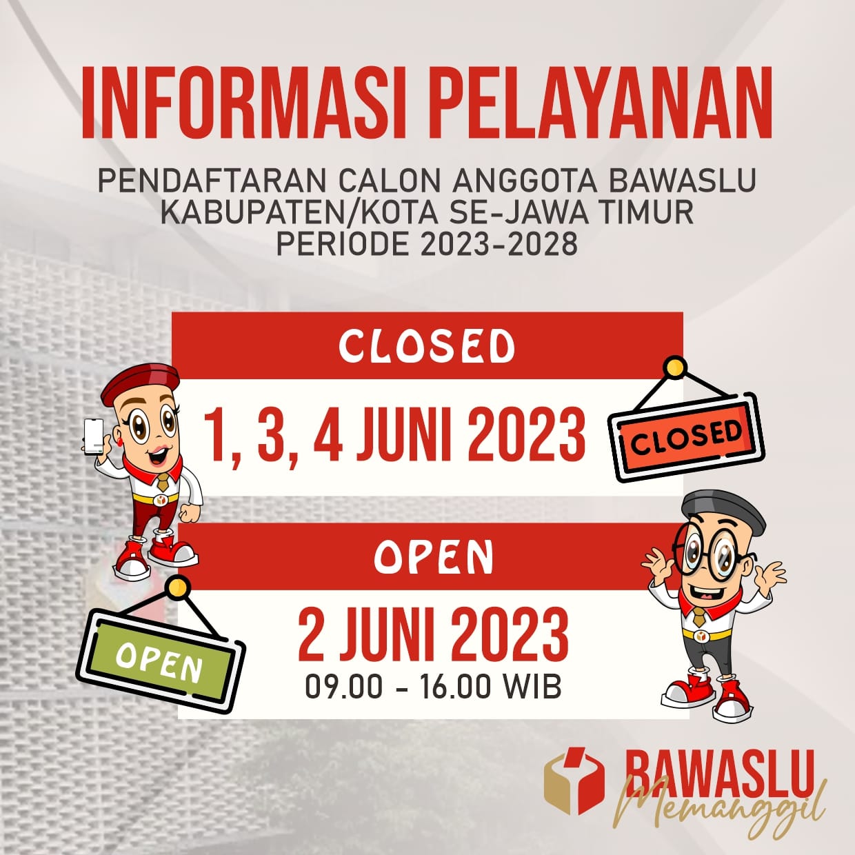 Informasi Pelayanan Pendaftaran Calon Anggota Bawaslu Kabupaten/Kota se-Provinsi Jawa Timur Periode 2023-2028