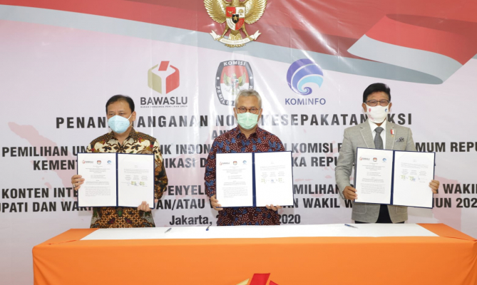 Penandatangan Nota Kesepakatan Aksi Nomor: K.Bawaslu/Hm/02.00/Viii/2020, Nomor Pr.07-Nk/01/Kpu/Viii/2020, dan Nomor: 581/Mou/M.Kominfo/Hk.04.01/8/2020 ini dilakukan oleh Ketua Bawaslu Abhan, Ketua KPU Arief Budiman, dan Menteri Komunikasi dan Informatika (Menkoinfo) Jhonny G Plate di Lantai 4 Gedung Bawaslu RI, Jakarta, Jumat (28/8/2020).