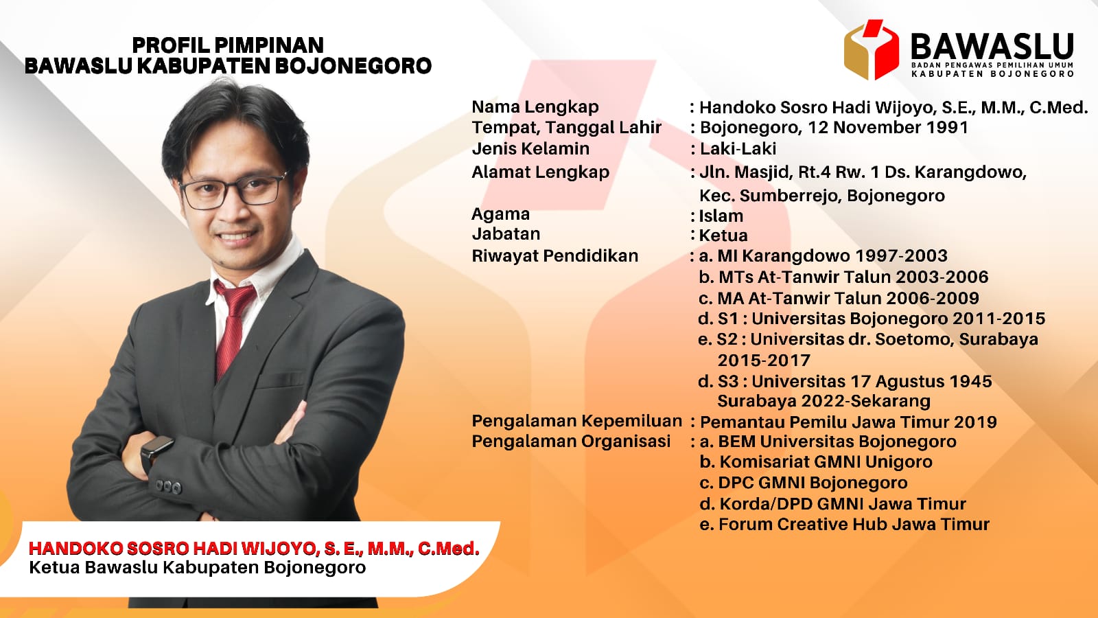 Handoko Sosro Hadi Wijoyo, S.E., M.M. (Ketua Bawaslu Kabupaten Bojonegoro).
