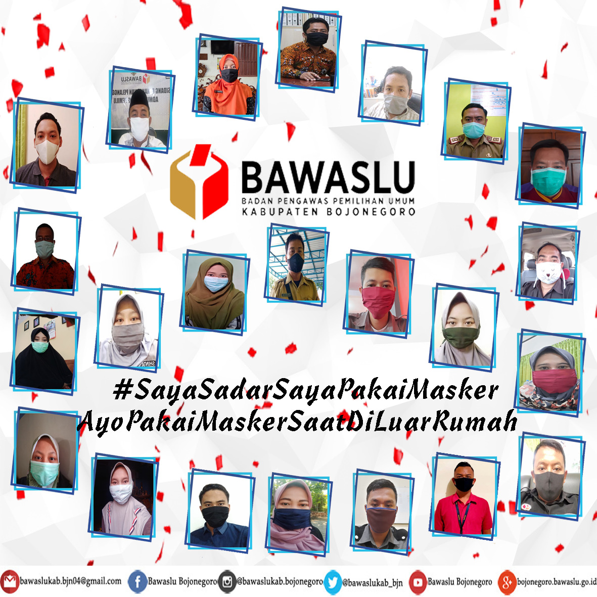Bojonegoro, bojonegoro.bawaslu.go.id – Lawan Covid-19 Bawaslu kabupaten/kota se Jawa Timur lakukan sosialisasi gerakan mengajak masyarakat gunakan masker saat di luar rumah. Sosialisasi ini dilakukan dengan mengunggah foto menggunakan masker ke media sosial Bawaslu dan media sosial pengawas Pemilu. Sosialisasi tersebut diikuti oleh 778 pengawas Pemilu se Jatim dengan menggunakan masker dengan tagar #AyoPakaiMaskerSaatDiLuarRumah #PakaiMaskerKeren #PakaiMaskerMelindungimuDanMelindungiku.