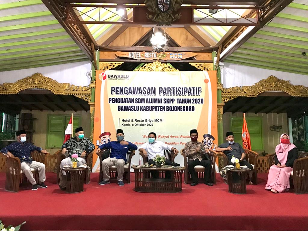 Bojonegoro, bojonegoro.bawaslu.go.id – Pemilu yang berintegritas itu ada 3 faktor yang mempengaruhi, yang pertama adalah penyelenggara, peserta Pemilu dan peran masyarakat. Hal tersebut di sampaikan Koordinator Divisi Hukum, Humas dan Datin Bawaslu Bojonegoro, Mujiono saat menyampaikan sambutan dalam membuka kegiatan diskusi pengawasan bersama alumni SKPP, Selasa (09/09/2020).