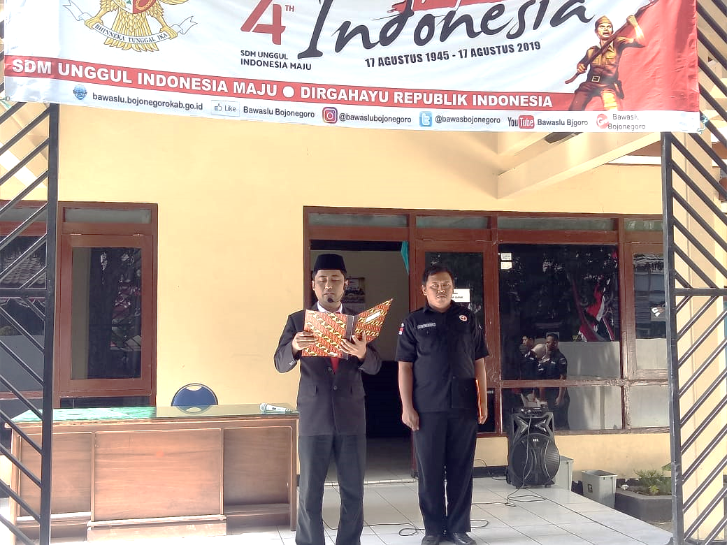 Inspektur upacara memasuki tempat upacara mengenakan jas hitam dan dasi merah bersama ajudan upacara. Upacara dibuka oleh laporan komandan upacara kepada Inspektur Upacara yaitu Moch. Zaenuri. "Laksanakan" tegas ketua Bawaslu membuka jalannya upacara di halaman kantor Bawaslu Bojonegoro pada hari Selasa, 01/10/2019.