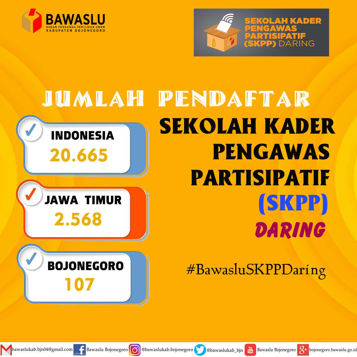 Bojonegoro, bojonegoro.bawaslu.go.id- Bawaslu Republik Indonesia (RI) telah mengumumkan jumlah pendaftar Sekolah Kader Pengawasan Partisipatif (SKPP) daring dari tiap provinsi hingga tiap Kabupaten/Kota se Indonesia. Dari pengumuman tersebut, jumlah peminat sebanyak 20.665 orang se Indonesia. Sementara Bojonegoro merupakan Kabupaten/Kota yang mendapatkan peminat sejumlah 107 orang dari jumlah total peminat 2.568 orang se Jawa Timur.