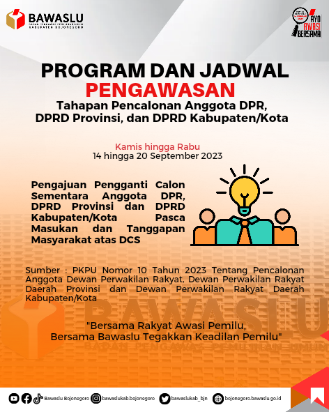 Bojonegoro, bojonegoro.bawaslu.go.id - Hai sahabatbawaslu mulai tanggal 14 hingga 20 September 2023 merupakan tahapan Pengajuan Pengganti Calon Sementara Anggota DPR, DPRD Provinsi dan DPRD Kabupaten/Kota Pasca Masukan dan Tanggapan Masyarakat atas DCS.