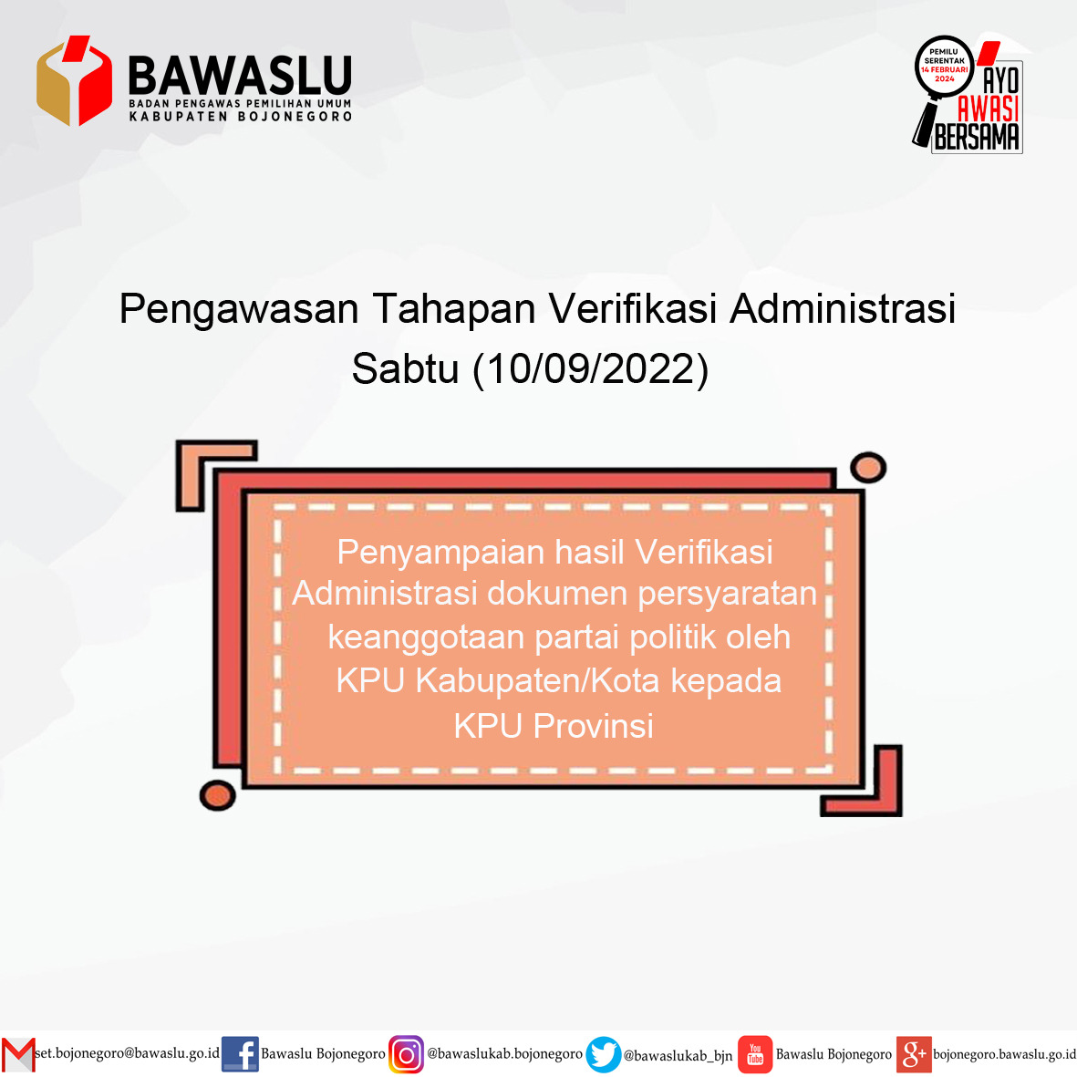 Program dan Jadwal Kegiatan Pengawasan Kegiatan Verifikasi hari Sabtu (10/09/2022) Penyampaian hasil verifikasi administrasi dokumen persyaratan keanggotaan partai politik oleh KPU Kabupaten/Kota kepada KPU Provinsi