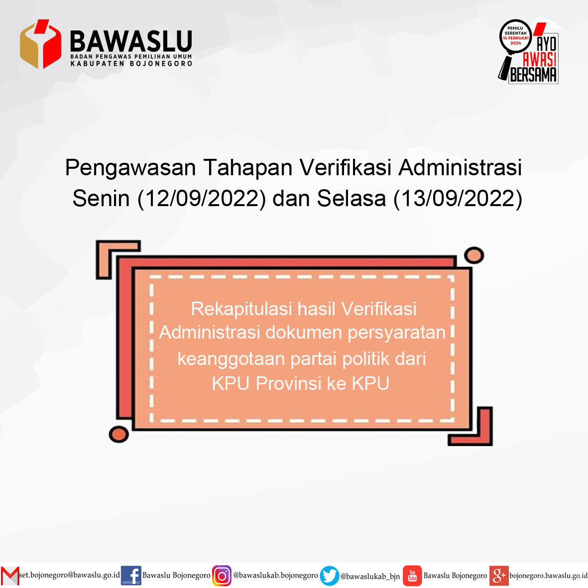 Program dan Jadwal Kegiatan Pengawasan Kegiatan Verifikasi hari Senin (12/09/2022) hingga hari Selasa (13/09/20222) yaitu rekapitulasi hasil verifikasi administrasi dokumen persyaratan keanggotaan partai politik dari KPU provinsi kepada KPU.