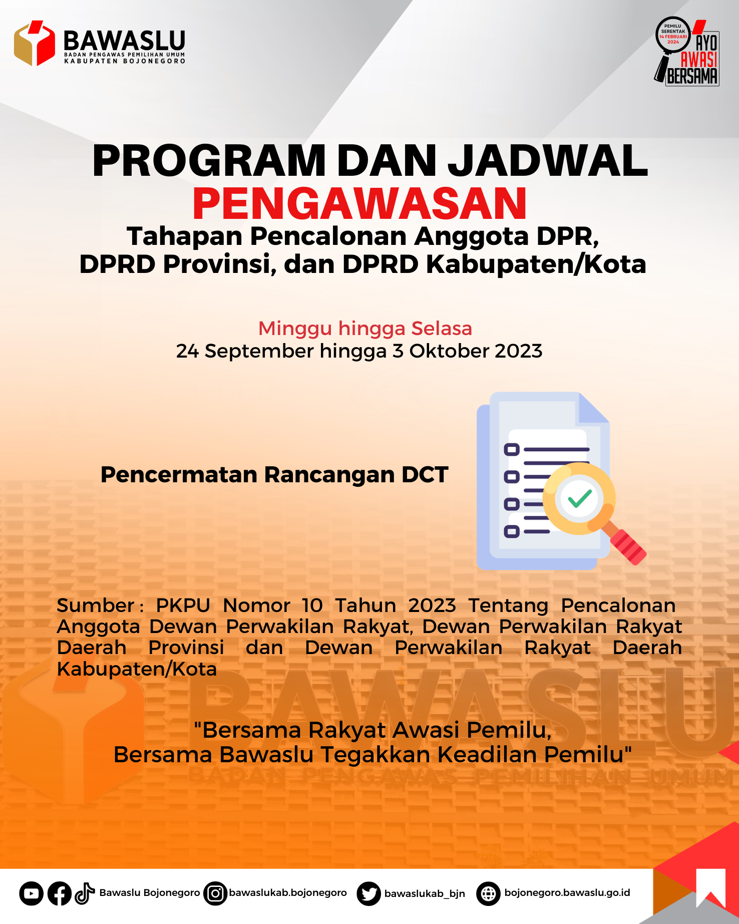 Bawaslu Kabupaten Bojonegoro mengajak seluruh masyarakat bersama awasi tahapan Pemilu 2024. Laporkan ke Bawaslu jika sahabatbawaslu menjumpai pelanggaran Pemilu.