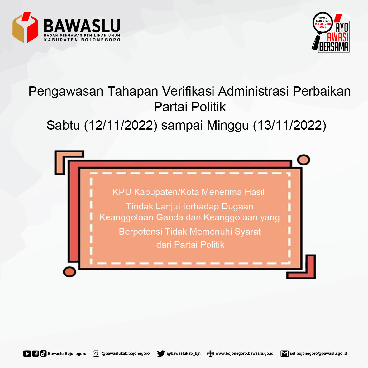 Bojonegoro, bojonegoro.bawaslu.go.id - Sesuai dengan Keputusan Komisi Pemilihan Umum Nomor 460 Tahun 2022 tentang Tahapan, Program dan Jadwal Penyerahan Dokumen Persyaratan Perbaikan, Verifikasi, Dan Penetapan Partai Politik Peserta Pemilihan Umum Anggota Dewan Perwakilan Rakyat dan Dewan Perwakilan Rakyat Daerah sebagai Tindak Lanjut Putusan Badan Pengawas Pemilu Republik Indonesia Terhadap Partai Keadilan dan Persatuan, Partai Rakyat Adil Makmur, Partai Republik, Partai Swara Rakyat Indonesia dan Partai Republiku Indonesia adalah sebagai berikut bahwa Bawaslu melaksanakan pengawasan terhadap tahapan verifikasi administrasi perbaikan Partai Politik terkait tindak lanjut hasil verifikasi administrasi oleh Partai Politik terhadap dugaan keanggotaan ganda dan keanggotaan yang berpotensi tidak memenuhi syarat keanggotaan.