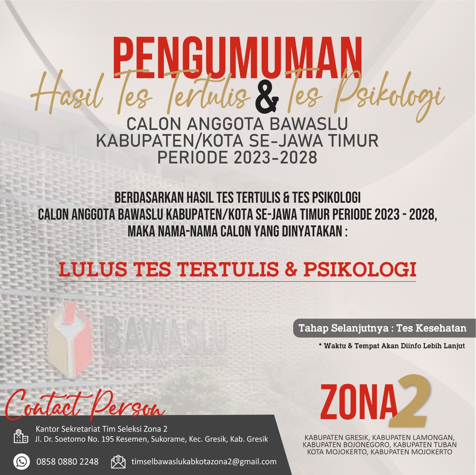 Pengumuman Hasil Tes Tertulis dan Tes Psikologi Calon Anggota Bawaslu Kabupaten/Kota Periode 2023-2028