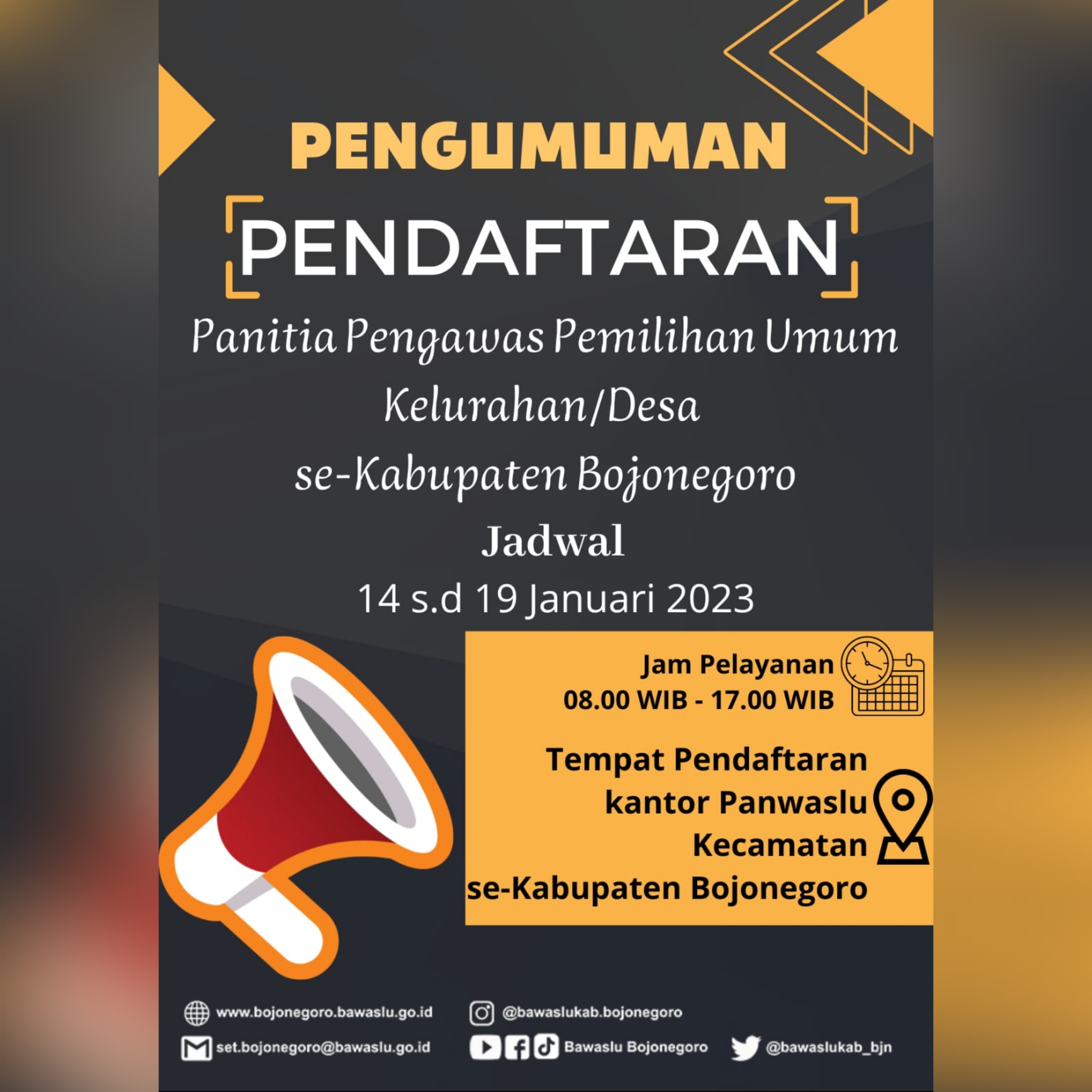 Bojonegoro, bojonegoro.bawaslu.go.id - Pendaftaran Panitia Pengawas Pemilihan Umum (Panwaslu) Kelurahan/Desa se Kabupaten Bojonegoro dilaksanakan pada tanggal 14 hingga 19 Januari 2023.