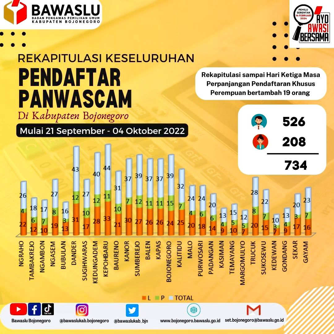 Bojonegoro, bojonegoro.bawaslu.go.id- Selasa (04/10/2022) Pendaftaran Panitia Pengawas Pemilihan Umum (Panwaslu) Kecamatan telah berakhir tanggal 27 September. Akan tetapi karena dari jumlah pendaftar keterwakilan 30 persen dari pendaftar perempuan belum terpenuhi, maka Bawaslu Bojonegoro membuka kembali perpanjangan pendaftaran Panwaslu Kecamatan.
