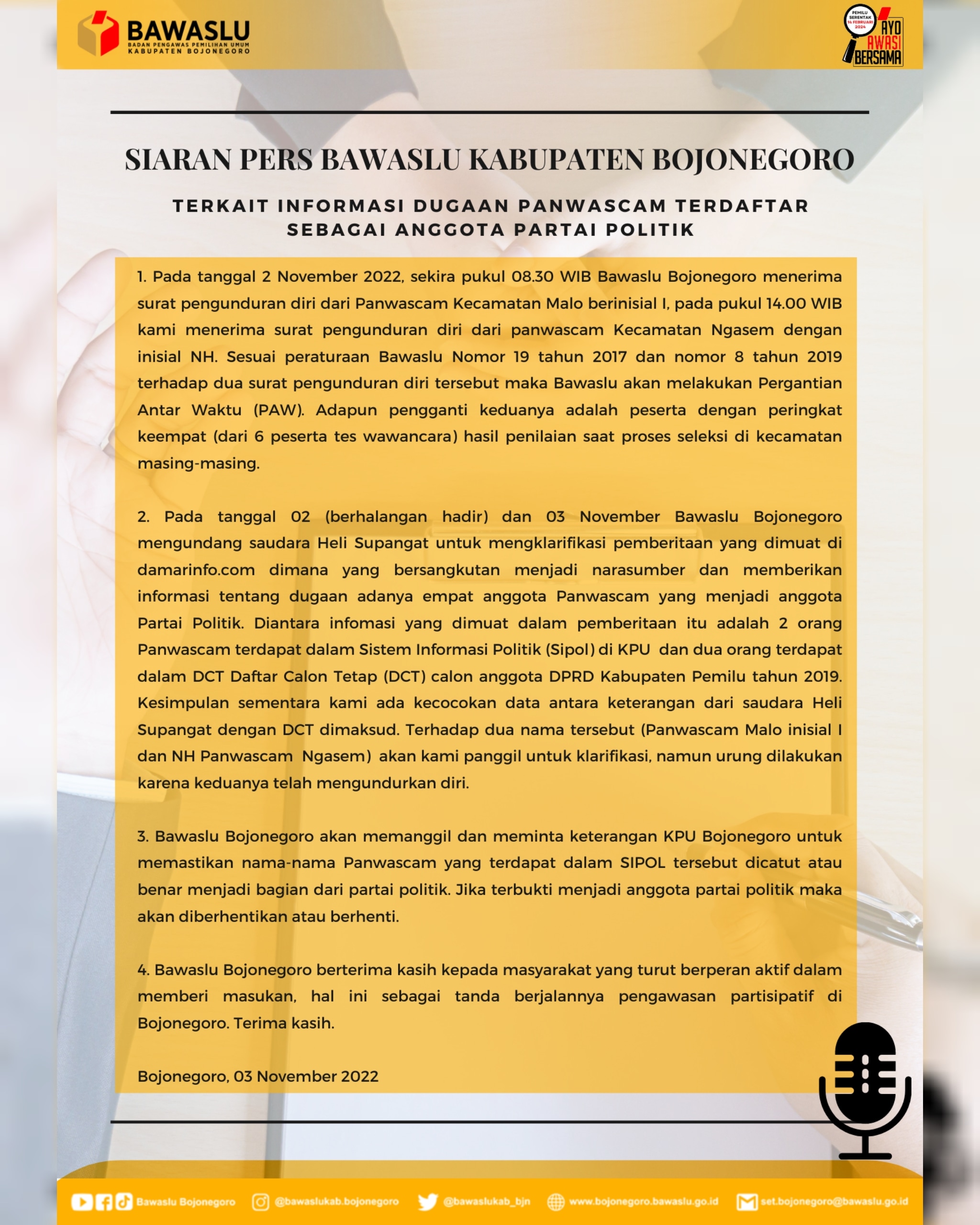 - Pada tanggal 2 November 2022, sekira pukul 08.30 WIB Bawaslu Bojonegoro menerima surat pengunduran diri dari Panwascam Kecamatan Malo berinisial I, pada pukul 14.00 WIB kami menerima surat pengunduran diri dari panwascam Kecamatan Ngasem dengan inisial NH. Sesuai peraturaan Bawaslu Nomor 19 tahun 2017 dan nomor 8 tahun 2019 terhadap dua surat pengunduran diri tersebut maka Bawaslu akan melakukan Pergantian Antar Waktu (PAW). Adapun pengganti keduanya adalah peserta dengan peringkat keempat (dari 6 peserta tes wawancara) hasil penilaian saat proses seleksi di kecamatan masing-masing.