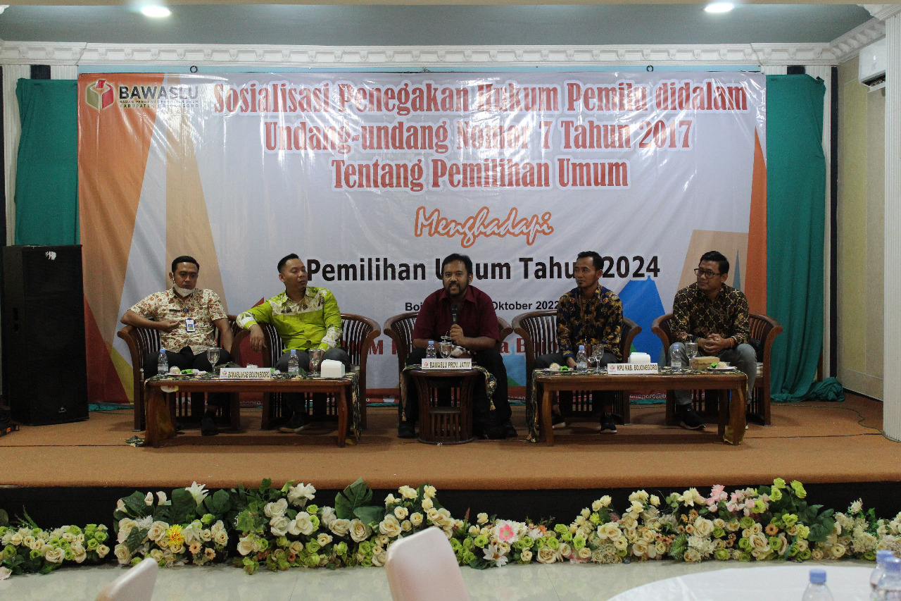 Bojonegoro, bojonegoro.bawaslu.go.id - Dalam rangka meningkatkan pengetahuan masyarakat di Kabupaten Bojonegoro tentang kerangka undang-undang Nomor 7 Tahun 2017 maka badan pengawas Pemilihan Umum Kabupaten Bojonegoro menyelenggarakan kegiatan sosialisasi penegakan hukum pemilu dalam undang-undang Nomor 7 Tahun 2017 tentang Pemilihan Umum untuk menghadapi Pemilihan Umum tahun 2024. Kegiatan dilaksanakan di Hotel & Resto Griya MCM Jl. Pemuda Timur No. 5A Ngrowo Kecamatan Bojonegoro Kabupaten Bojonegoro, Kamis (13/10/2022)