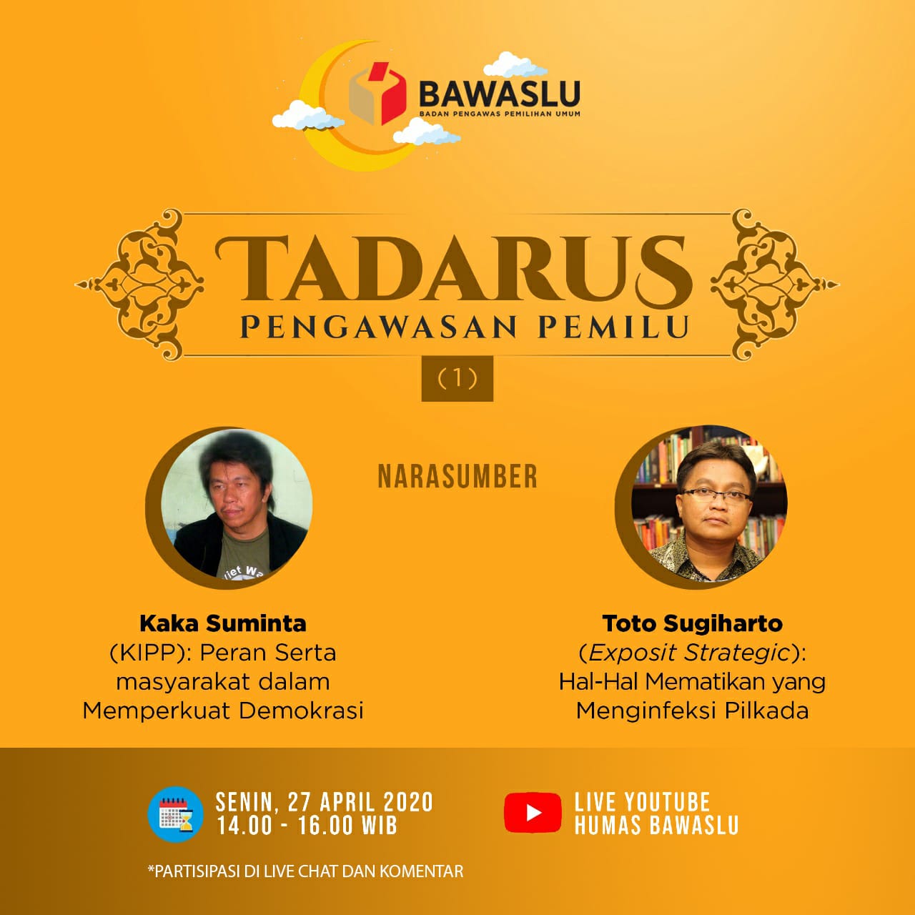 bojonegoro.bawaslu.go.id - Tadarus pengawasan pemilu pertama berlangsung pada hari ini, jam 14.00-16.00 di akun Yutube Humas Bawaslu RI. Toto Sugiharto dari Exposite Strategic yang mengisi tadarus hari ini memaparkan terdapat lima hal mematikan yang menginfeksi Pilkada. Yakni, mekanisme penentuan calon yang oligarkis, pilkada yang tersandera dengan uang, integritas yang terpinggirkan, arena mementingkan diri sendiri dan menipu rakyat, hingga kualitas penyelenggara yang belum maksimal.