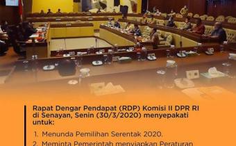 Pemilihan Serentak tahun 2020 untuk 270 daerah di seluruh Indonesia yang sedianya akan dilaksanakan pada bulan September 2020 akhirnya disepakati ditunda.