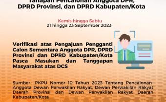 Bojonegoro, bojonegoro.bawaslu.go.id-Hai sahabatbawaslu mulai tanggal 21 hingga 23 September 2023 merupakan Verifikasi atas Pengajuan Pengganti Calon Sementara Anggota DPR, DPRD Provinsi dan DPRD Kabupaten/Kota Pasca Masukan dan Tanggapan Masyarakat atas DCS.