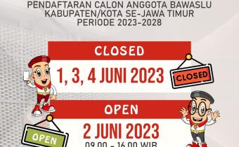 Perpanjangan Pendaftaran Calon Anggota Bawaslu Kabupaten/Kota se-Jawa Timur Periode 2023-2028 Zona 2 tanggal 13 hingga 21 Juni 2023.