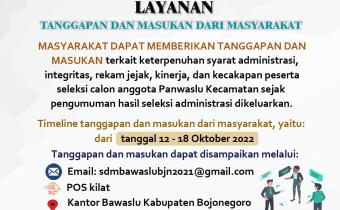 Masyarakat dapat memberikan tanggapan dan masukan terkait keternuhan syarat administrasi integritas rekam jejak kinerja dan kecakapan beserta seleksi calon anggota Panwaslu Kecamatan sejak pengumuman hasil seleksi administrasi dikeluarkan timeline tanggapan dan masukan dari masyarakat yaitu dari